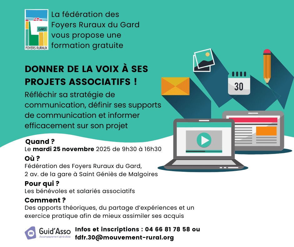 25 novembre | 9 h 30 min - 16 h 30 min Formation Fédération des foyers ruraux du Gard Fédération des foyers ruraux du Gard 2 avenue de la Gare, Saint Geniès de Malgoirès,