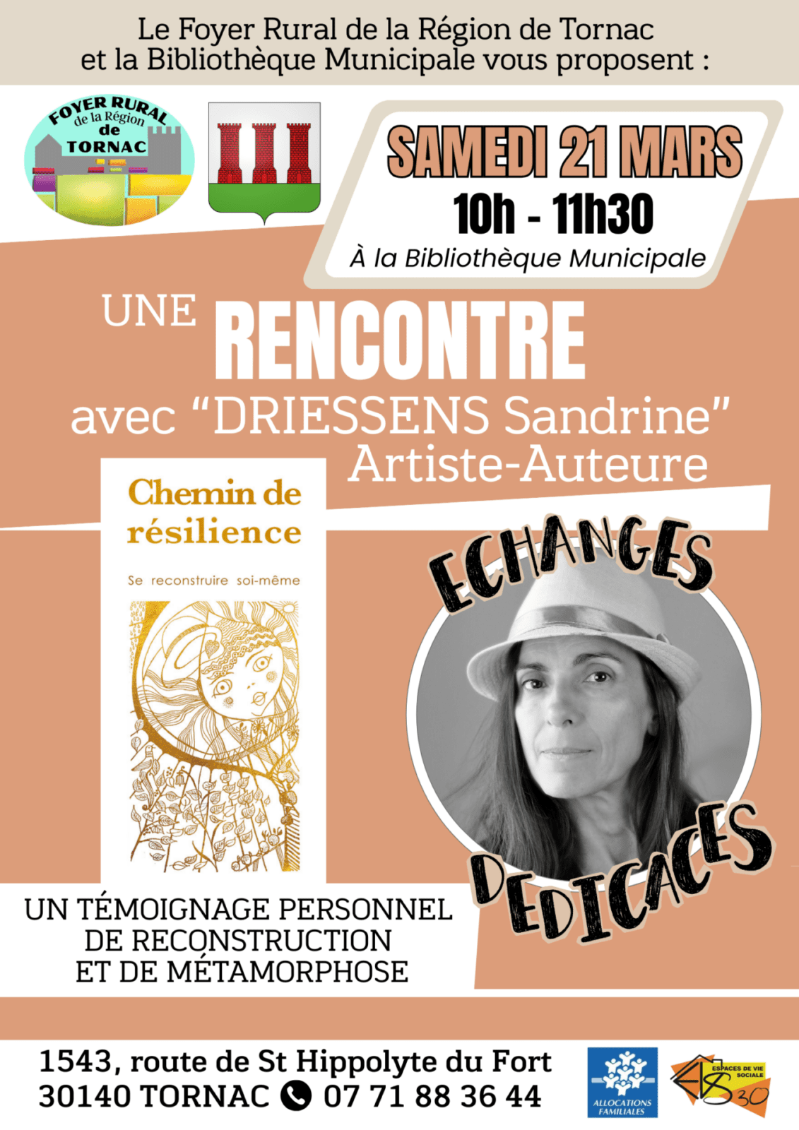 Le Foyer Rural de la Région de Tornac et la Bibliothèque Municipale ont le plaisir de vous inviter à une belle matinée de partage autour des livres. Le samedi 21 mars 2026, de 10h à 11h30, venez rencontrer Sandrine Driessens, qui présentera son livre « Chemin de résilience ». Au programme : échanges avec l’auteure, […]